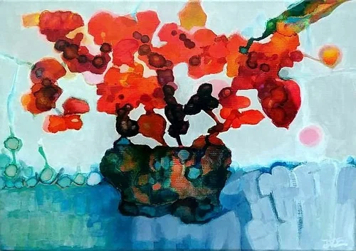 Acrylic on canvas. No commercial brushes were used, using my own prepared brushes and things to daub with. This was really freeing to do and hope to create more soon.